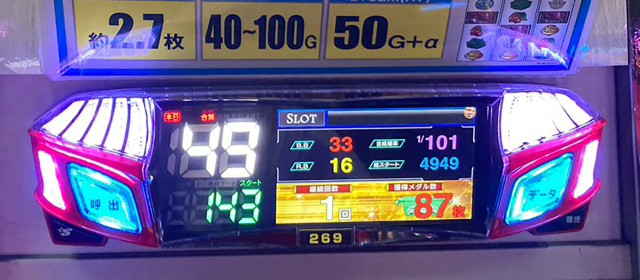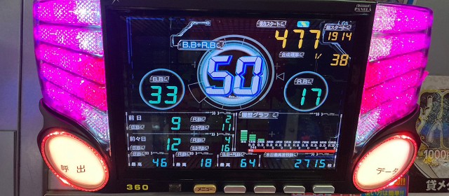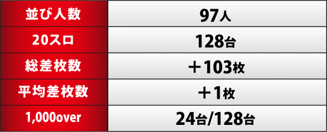 今回、[1,000円/46枚]スロ全128台のトータル差枚数は+103枚と、初戦勝利を成し遂げたのは嬉しいが、正直言うと物足りない数値に終わった。