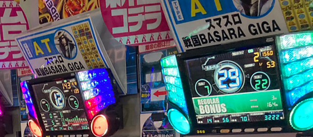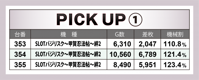 ベテランながらまだまだ人気の『SLOTバジリスク~甲賀忍法帖~絆2』3台は、当取材では最高となる+6千7百枚超の台を含みトータルでは+1万5千枚達成間近の結果に。