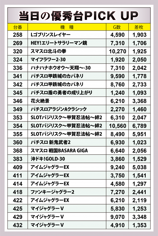 まずは優秀24台のPICK UPをチェック。「英雄」取材は定例だと上位30台を列挙していくのだが、今回は6台が満たなかったのが残念。24台のうち全体の半数となる12台が差枚数+2千枚以上を達成、+3千枚以上は5台、+5千枚オーバーは3台となった。