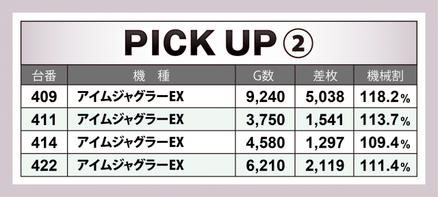 また『アイムジャグラーEX』4台は、+5千枚超を筆頭に合計+1万枚目前の記録となった。