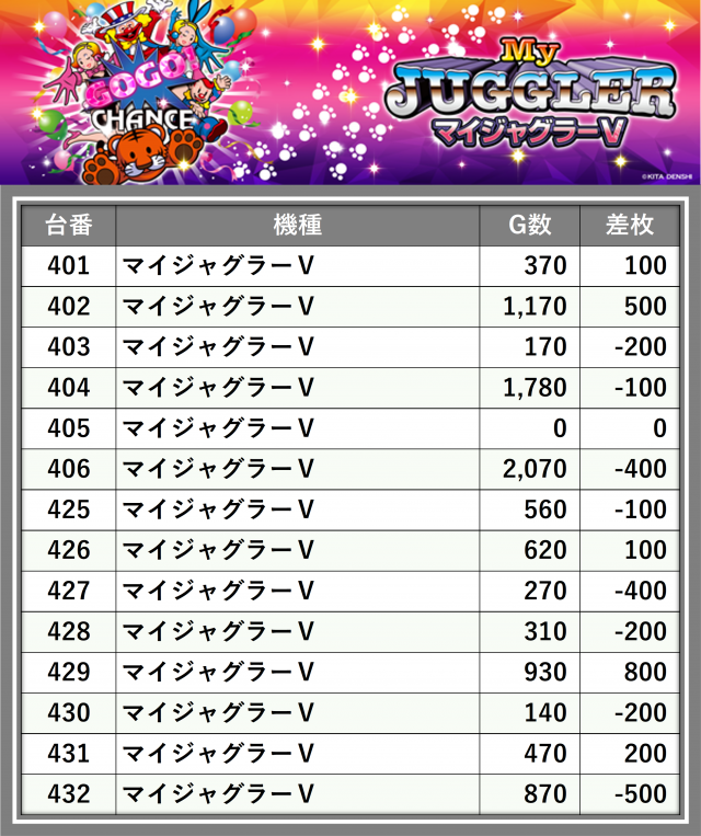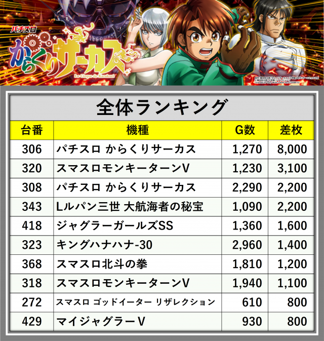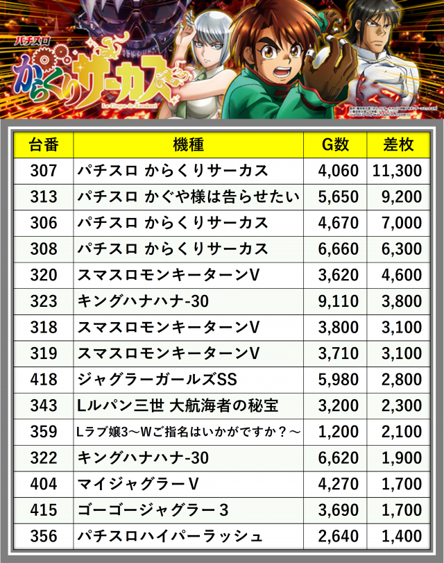 厳選された取材対象機種をはじめ、その他スロット全体から好記録が飛び出した!プレイヤーが楽しんだ1日を下記データにて振り返ってみて欲しい。