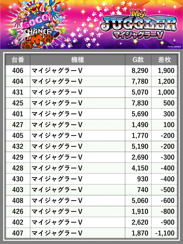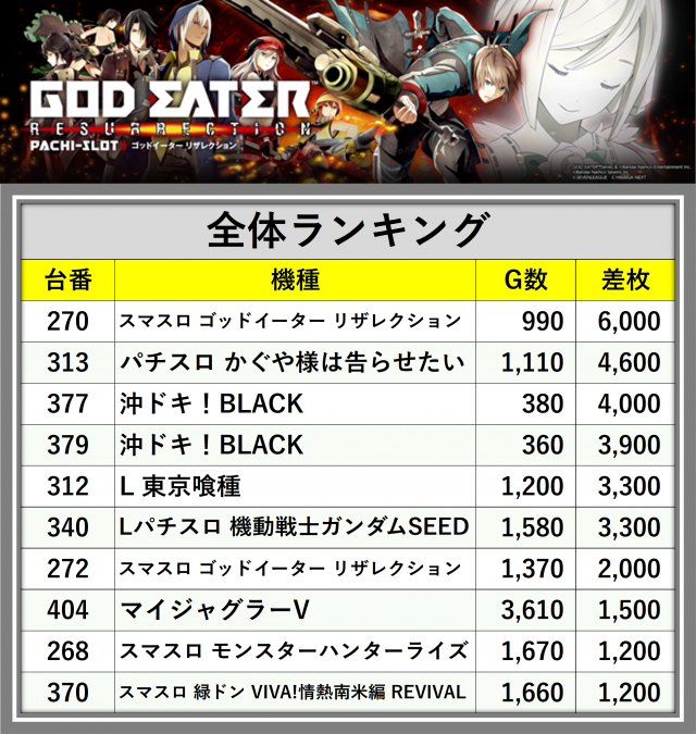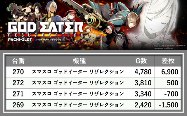厳選された取材対象機種をはじめ、その他スロット全体から好記録が飛び出した!プレイヤーが楽しんだ1日を下記データにて振り返ってみて欲しい。