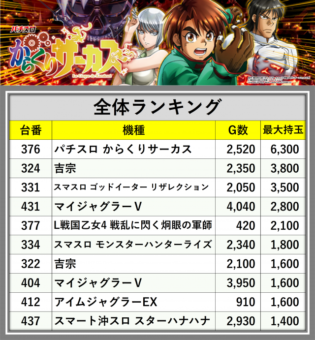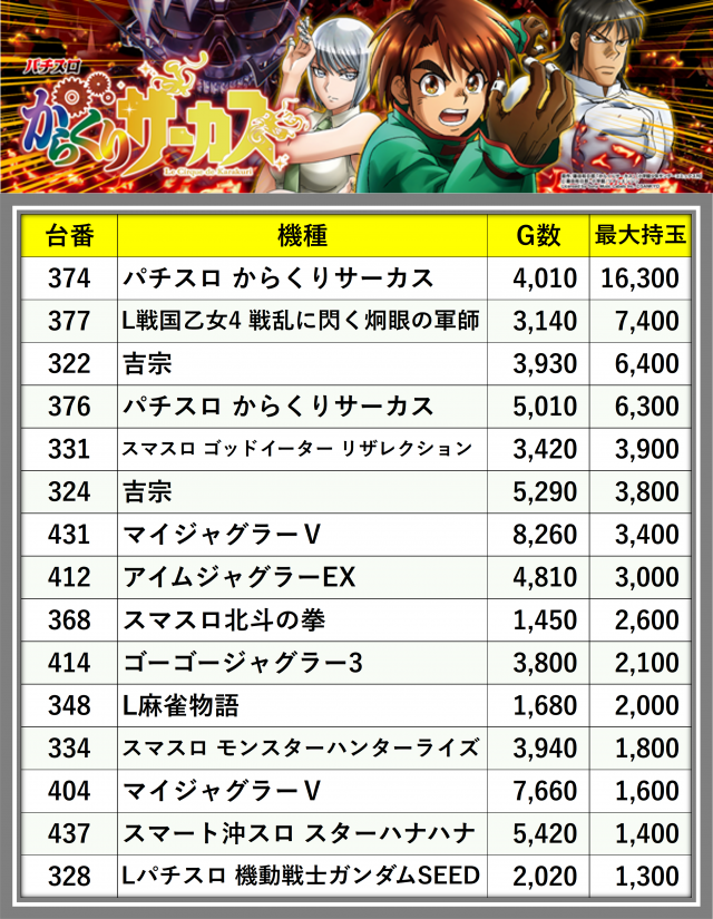 厳選された取材対象機種をはじめ、その他スロット全体から好記録が飛び出した!プレイヤーが楽しんだ1日を下記データにて振り返ってみて欲しい。