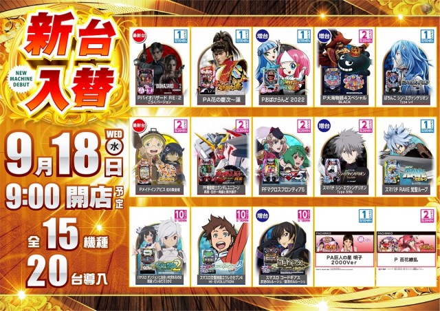 💥本日9/18新台入替予定💥最新台💥全15機種導入💥