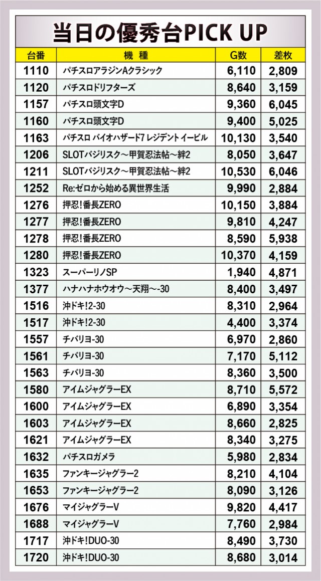 上表の通り、人気機種の名前がズラリと並んでいるのが特徴的だ。特に秀でた数字を残したのが『パチスロ頭文字D』1157番台+6,045枚となっており、これに続いて『SLOTバジリスク~甲賀忍法帖~絆2』『チバリヨ-30』などで5千枚OVERが発生した。AT機・ノーマル機・沖スロといった幅広い機種が満遍なく熱気を放ち、当日の館内がどれほどの熱気に包まれていたのかは、もはや説明不要ではないだろうか。