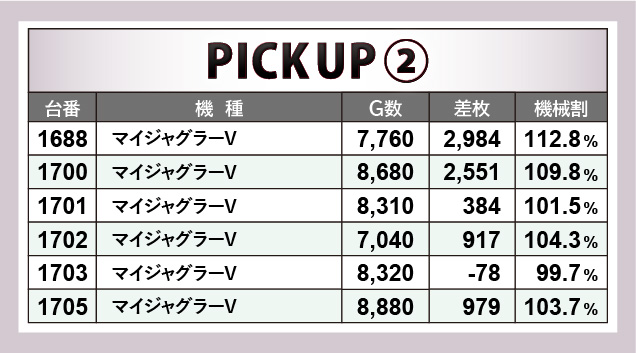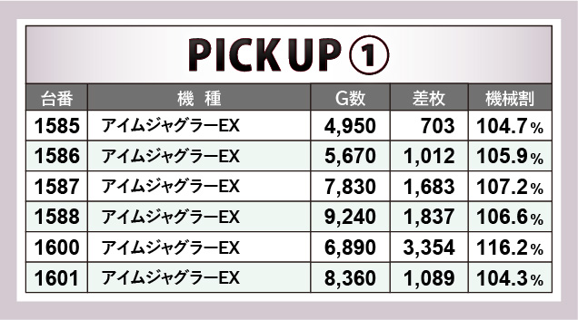 まずノーマル機からは、『アイムジャグラーEX』『マイジャグラーV』に注目したい。それぞれ6台横並びの好況スポットを確認でき、マイナスこそあれど、回転数と差枚数が比例するような結果が生まれた。まとまりのある出玉感、そしてコンスタントに光輝くGOGOランプは、遊技するファンに自信をもたらしていたに違いない。