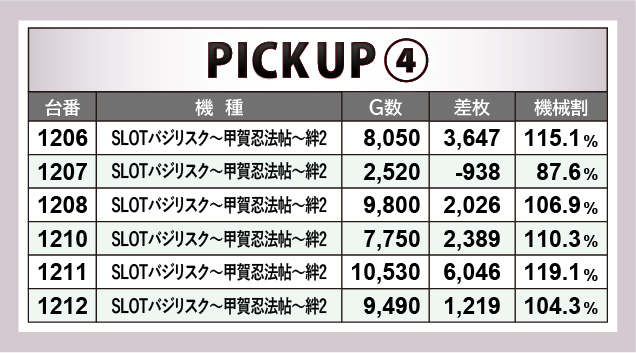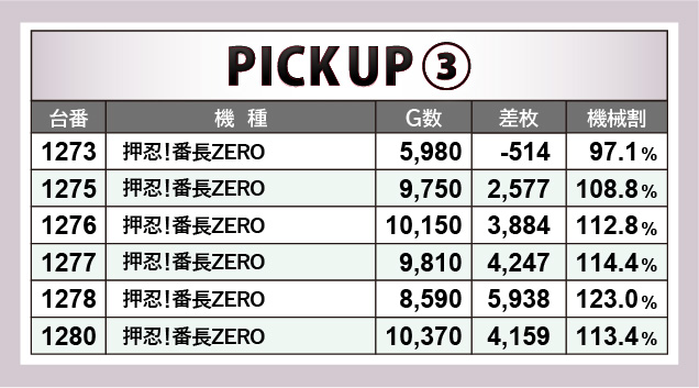 続いて人気AT機である『押忍!番長ZERO』は、万回転到達台が2台見られた。こちらも回転数が増えるにつれて、大量獲得に成功したという印象を強く受ける。また『SLOTバジリスク~甲賀忍法帖~絆2』に関しても同様で、各台でまとまりのある出玉感を披露していたのが好感を覚えずにはいられない。パチスロ界を引っ張る二大巨頭の活躍は、これからも見逃すことができないだろう。