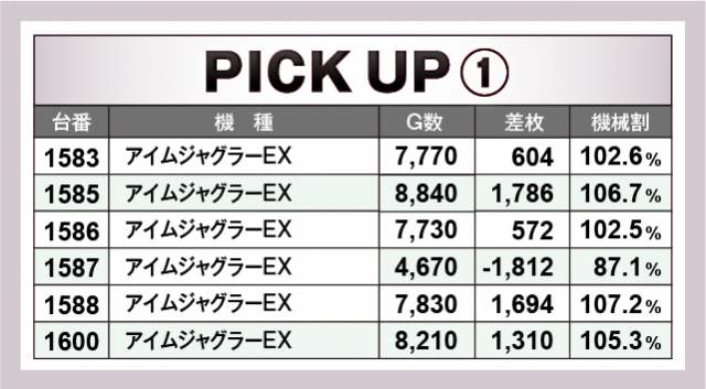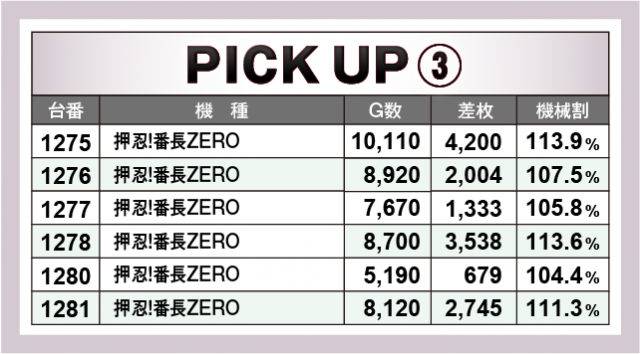続いてはこの日に現れた4か所の横並び好況スポット。『アイムジャグラーEX』では1台を除き5台がプラス差枚!高回転数を記録していることからもプレイヤーの確信した上で必死にレバーを叩いている姿が想像できるだろう!また『沖ドキ!DUO-30』、『押忍!番長ZERO』、『SLOTバジリスク~甲賀忍法帖~絆2』では、それぞれがトータル差枚数+1万枚以上を記録し、好調ぶりを見せつけてくれた。共に本店で多台数設置のメイン機種にこれだけの好調台を配置するとはファンも感激したであろう!