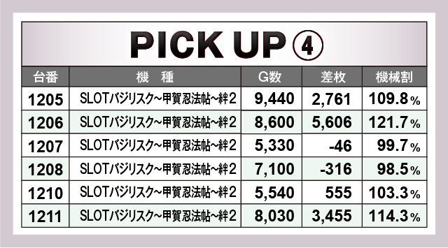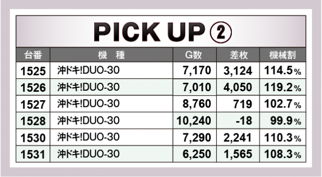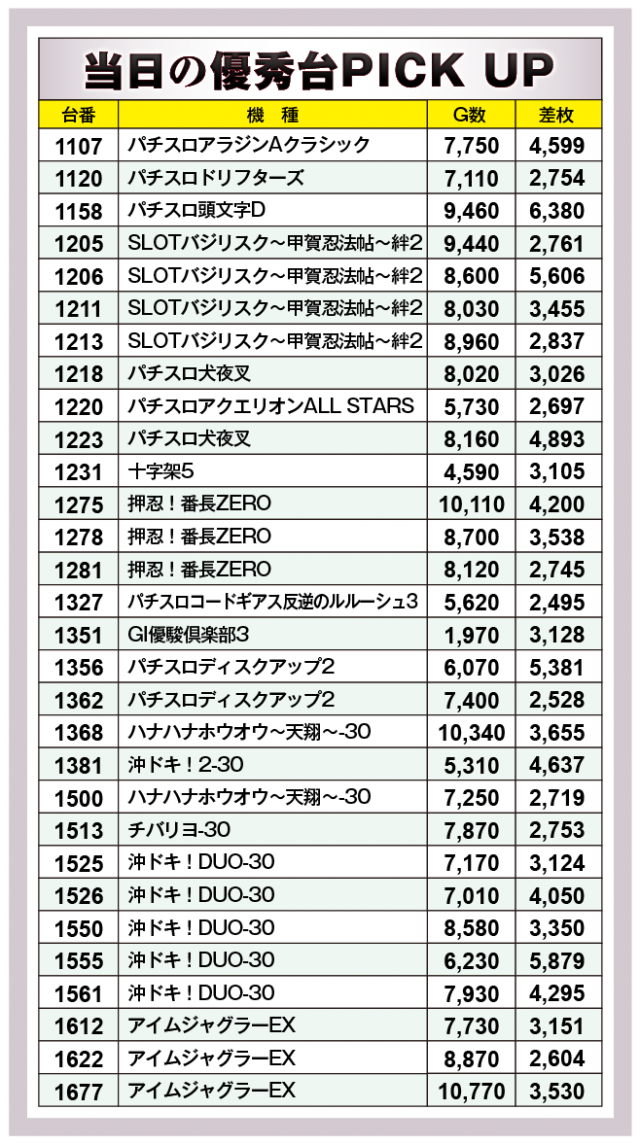 優秀台30台をチェックするとなんと全台が+2,000枚オーバー!その中で当日のトップを叩き出したのは、1158番台『パチスロ頭文字D』で+6,380枚である。次いで、1555番台『沖ドキ!DUO-30』が+5,879枚、さらに1206番台『SLOTバジリスク~甲賀忍法帖~絆2』が+5,606枚、そして1356番台『パチスロディスクアップ2』でも+5,381枚と大量出玉が続いた。その他にも様々な機種が名を連ねており、どの機種にもチャンスがあったという証だろう。