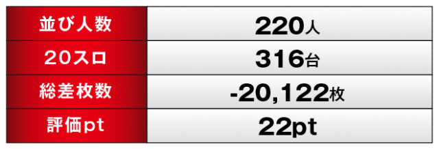 上記の通り大勢のファンが楽しんだ一日ではあったが、総差枚数は残念ながらマイナスとなってしまい、4連勝には手が届かなかった…。しかし評価ポイントは22ptと高いことから、多くのファンが満足する結果となったといえるだろう。次の機会には必ずリベンジを果たしてくれることを期待して、その時を待とうではないか!