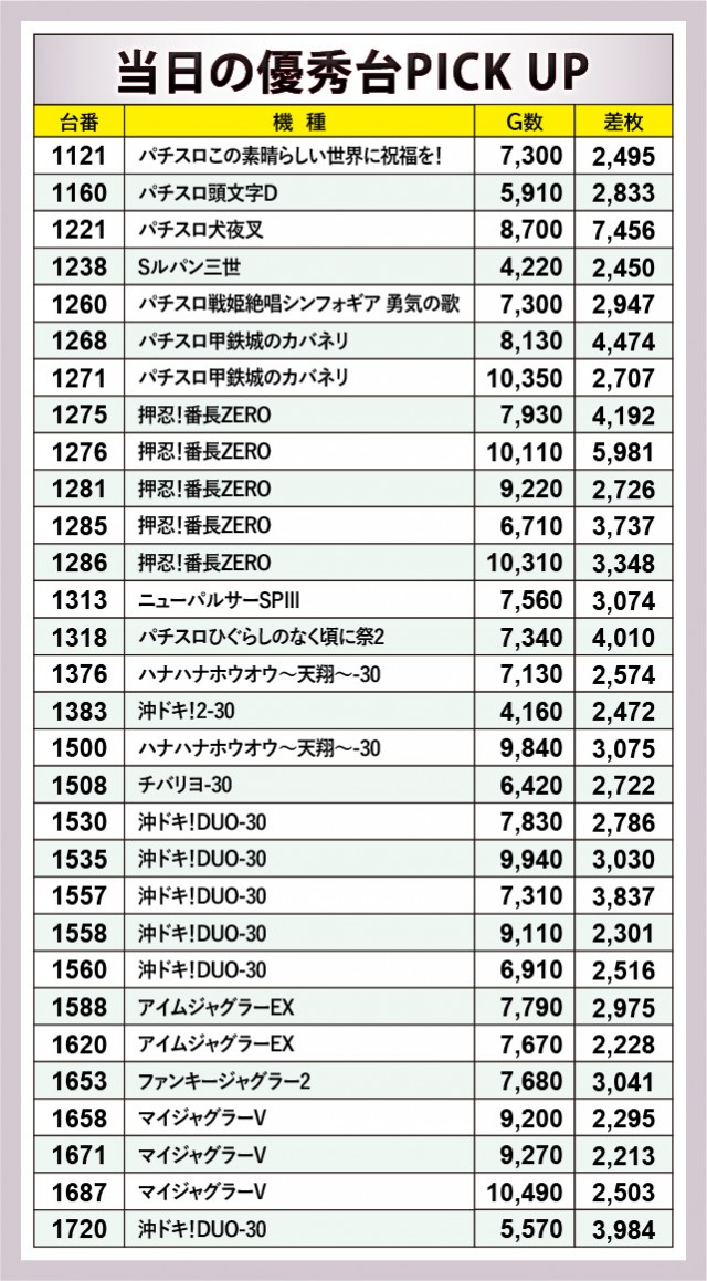 優秀台をチェックすると、朝から閉店までじっくりと打ち込まれた機種が多く見られます。万回転OVERが当然のように発生し、8~9千回転OVERも多発していることから、誰もが手ごたえを感じていた様子が如実に窺えるだろう。その中で『パチスロ犬夜叉』1221番台+7,456枚が先頭に立ち、『押忍!番長ZERO』1276番台+5,981枚も負けじと追随。さらには3~4千枚OVERを多く見受けられ、店内の盛り上がりは始終最高潮にあった。