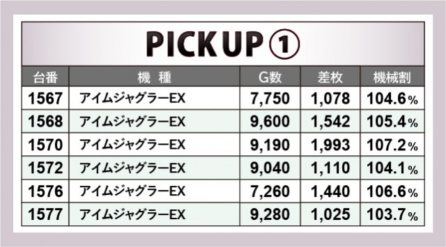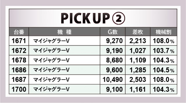 老若男女問わず愛される『アイムジャグラーEX』『マイジャグラーV』は、ともに安定感のある記録を残した。突出した記録こそ見られないが、消化されたゲーム数から鑑みるに、ファンは相当な手ごたえを感じていたのは間違いない。1687番台+2,503枚・1671番台+2,213枚といった記録から、コンスタントなボーナス当選を窺えるのも好印象だ。