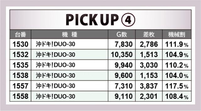 前回は敗北を喫してしまった同店だが、7月30日の「ヒーローズレポート」では総差枚数+14,224枚・評価ポイント20ptで見事に勝利!リベンジを達成するだけでなく、多くのファンの笑顔を届けたという事実は、同店として胸を誇れる内容だろう。今回の勝利に甘んじることなく、次回も積極的に勝利を狙うのは間違いない!同店の動向を細かく追ってもらい、ファン諸氏は来るべき日に備えることを推奨するぞ!