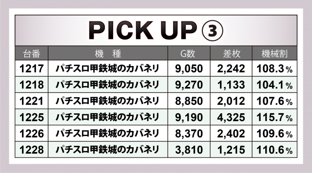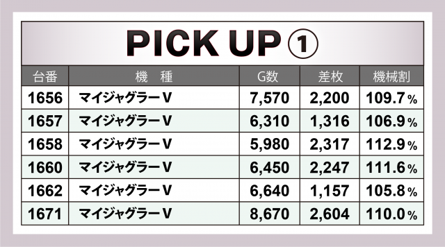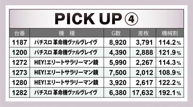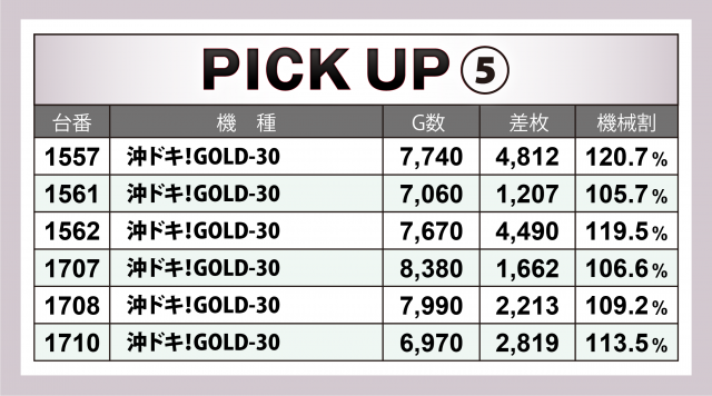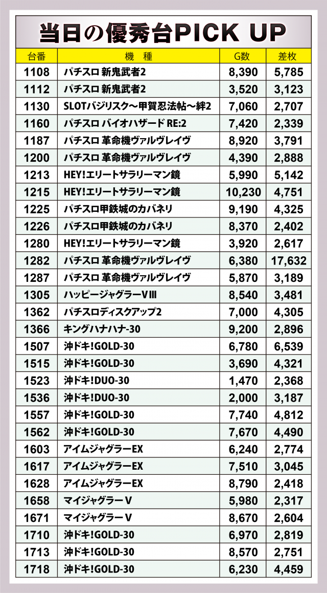 さらにこの日は、4機種計の好調マシンに注目。中でも、突き抜けたのが『パチスロ 革命機ヴァルヴレイヴ』。トップは+1万7千枚を突破し、4台の合計で+2万6千枚超を記録。同じくスマスロの『HEY!エリートサラリーマン鏡』は+5千枚超の台を筆頭に4台で+1万3千枚弱を成し遂げた。さらに『沖ドキ!GOLD-30』は+6千5百枚超の台を始めに+4千枚超×4台&7台トータルで+3万枚オーバーを決めた。その他では『パチスロ甲鉄城のカバネリ』が+4千枚超×1&+2千枚×3で6台合わせて+1万3千枚超を達成。また『マイジャグラーⅤ』では12台全てが4桁のプラス&+2千枚超×4という結果となった。