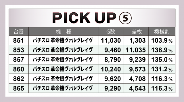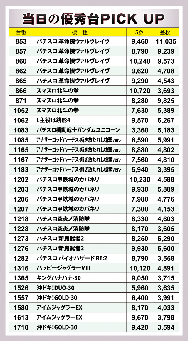 続いてこの日に好成績を収めた12機種計54台の好調マシンに注目。54台全てが4桁のプラスを成し遂げ、最も輝かしい差枚数を達成したのが万枚突破台を生み出した『パチスロ 革命機ヴァルヴレイヴ』。その他の台でも+9千枚超×2で6台トータルで+4万枚クリアとなった。