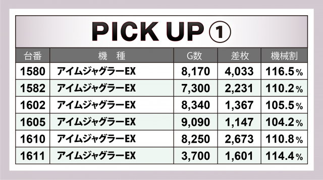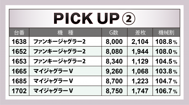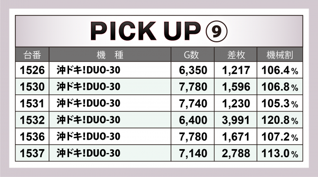 まずは優秀30台のPICK UPから。なんと30台全てが差枚数+3千枚以上を達成というハイレベルぶり。さらに+4千枚以上は全体の3分の2強となる21台、+5千枚オーバーは全体の3分の2弱となる18台、+6千枚オーバーは5台、驚くことに+9千枚オーバーは4台と、かなりの高水準となった。後述する好調マシン以外では、+6千枚突破となった『L主役は銭形4』、2台どちらも+5千枚オーバーをマークした『パチスロ 新鬼武者2』、2台合計で+8千枚超を記録した『パチスロ炎炎ノ消防隊』、+5千枚近くに達した『ハッピージャグラーⅧ』と、各自が優れた結果となった。