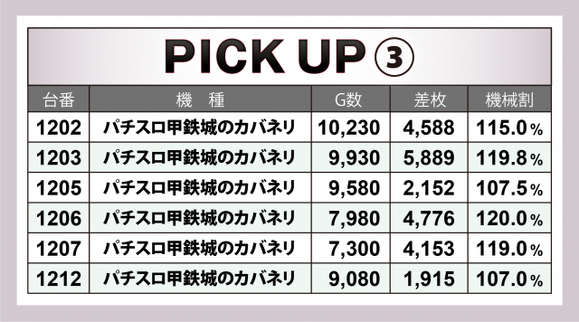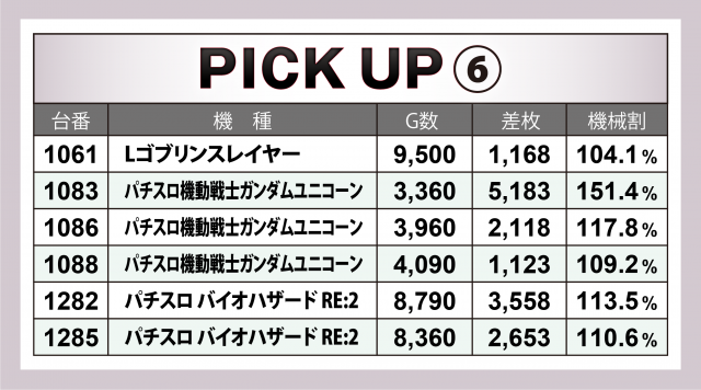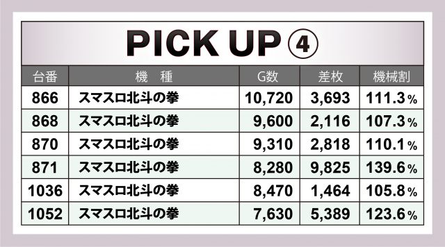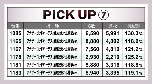 『ヴァルヴレイヴ』に次いだのが、どちらも1台平均+4千枚超のレベルの高さを見せた2機種。『スマスロ北斗の拳』は万枚到達目前の台を筆頭に6台合わせて+2万5千枚超のヒットとなった。また『アナザーゴッドハーデス-解き放たれし槍撃ver.-』は+6千枚弱×1&+5千枚弱×2で6台の合計が+2万4千枚超となった。
