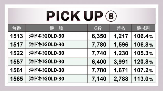 上記の他には『パチスロ甲鉄城のカバネリ』に+6千枚弱、『パチスロ機動戦士ガンダムユニコーン』に+5千枚超、さらには『沖ドキ!GOLD-30』『沖ドキ!DUO-30』といった30パイマシンや『マイジャグラーⅤ』『アイムジャグラーEX』などジャグラーシリーズにも+4千枚超&+3千枚超の台を複数カウントすることができた。