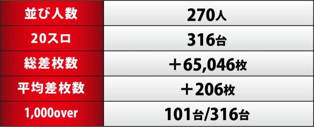 この日、20スロ316台のトータル差枚数は+65,046枚となり、2023年の中でもトップレベルの数値で白星を重ねた。また、1,000overは100台超となった上で全体の3分の1弱となり、他店取材の水準を大きく上回るトップレベルを実現することができた。これでトータルプラスの18連勝、今回の内容から言っても20連勝達成は間違いなし!?