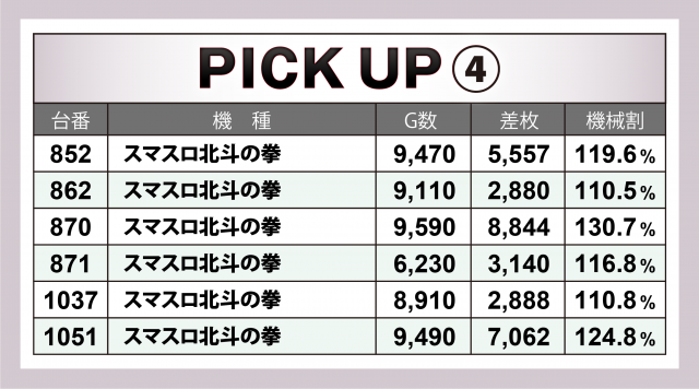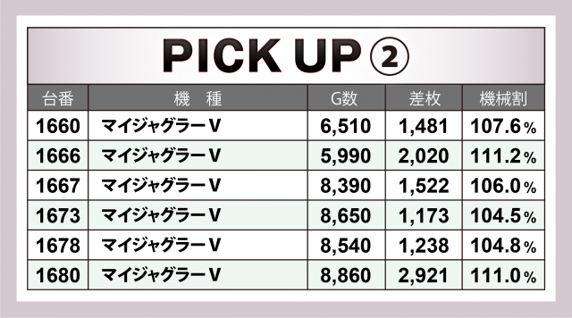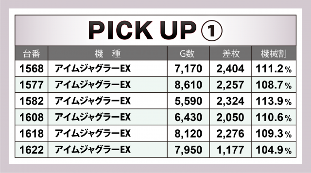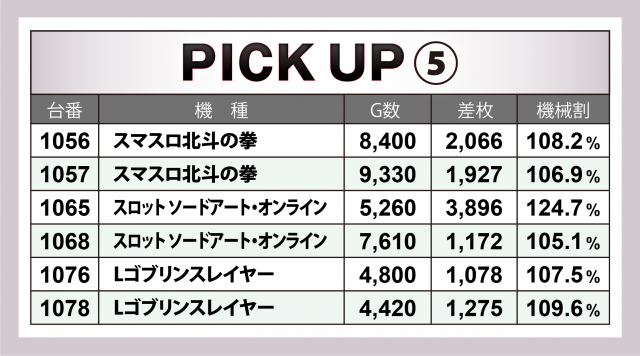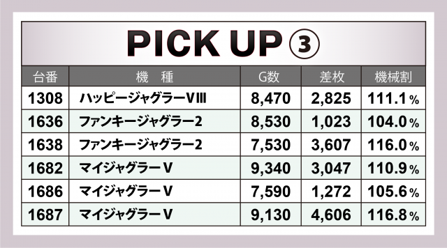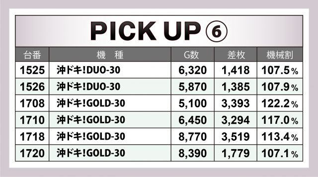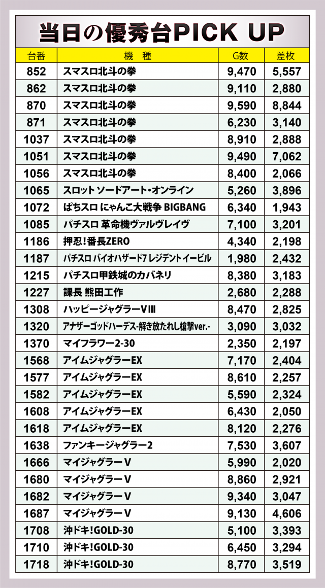 まずは優秀30台のPICK UPから。30台のうち29台が差枚数+2千枚以上を達成し、+3千枚以上は全体の半数弱となる14台、+4千枚オーバーは4台という結果となった。