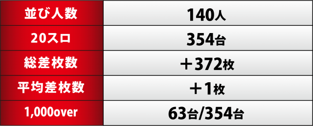 今回の取材では20スロ316台のトータル差枚数は3桁と僅かなものに終わり、連勝を伸ばすことはできたが、今までの戦績を考えると些か物足りないものとなった。一方、1,000overも100台を超えた前回よりも大きく数を落とし全体の2割を切ってしまったことは頂けない。20連勝の大記録を成し遂げた後とあって息切れ感を感じてしまったのが正直なところだが、同店のポテンシャルを考えれば、次回で見事復調してくれることは間違いないだろう。