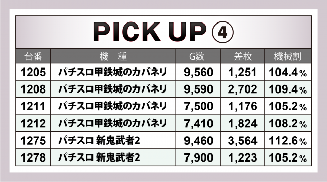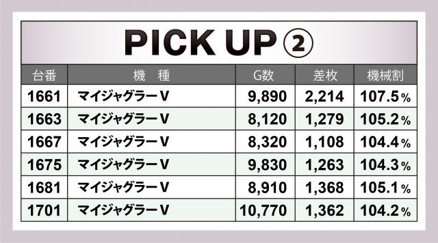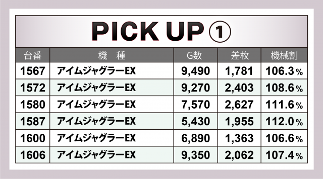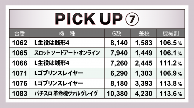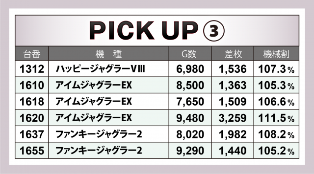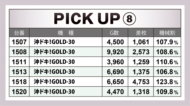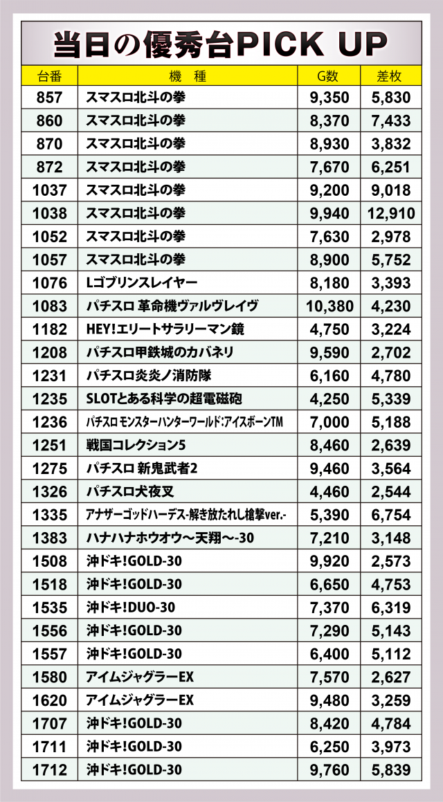最初は優秀30台のPICK UPからチェック。30台全てが差枚数+2千枚以上を達成し、+3千枚以上は全体の8割となる24台、+4千枚オーバーは全体の半数強となる17台、+5千枚オーバーは全体の半数弱となる13台、+6千枚オーバーは6台というハイレベルな結果となった。