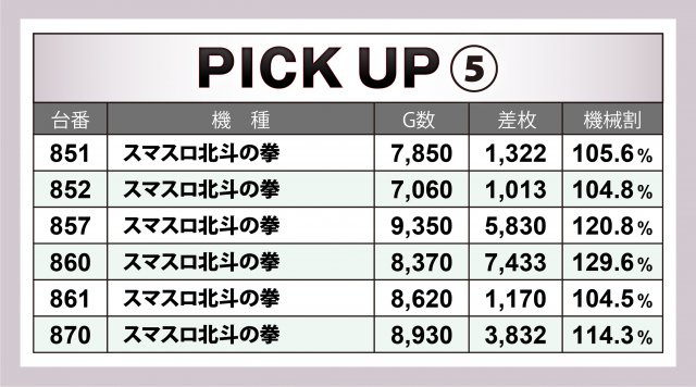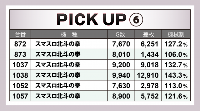 『スマスロ北斗』の差枚数を見るとトータルプラスの数値が信じられないような結果だが、好調台とマイナス台のメリハリが激しいことも読み取れる。今後、当ホールで「英雄」取材に挑む勇者たちは、上記のポイントを肝に銘じて勝負に挑んでもらいたい。