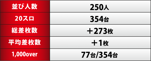 とは言え、上記写真が示す通り、見どころはあったはず。以下からは20スロ全354台の詳細出玉データから、当日の様子を振り返っていこう。