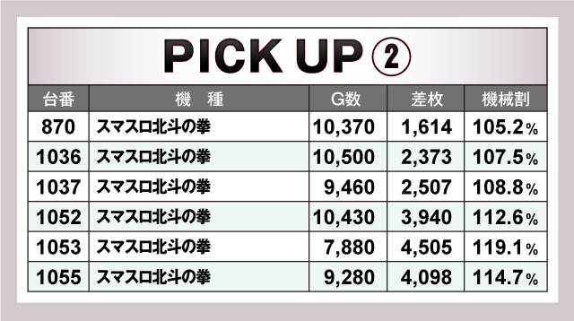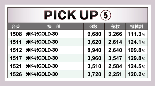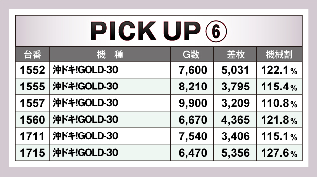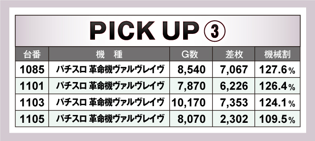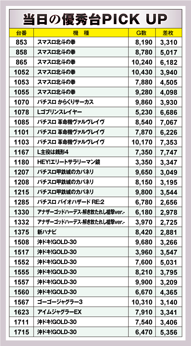 まずは優秀30台PICK UPから。30台全てが+2,000枚オーバーで、+3,000枚オーバーは26台。+5,000枚オーバーは9台と素晴らしい記録が続出! 中でも1167番台「L主役は銭形4」は+7,747枚の好記録を叩き出し最優秀台を獲得。続いて1103番台・1085番台の「パチスロ 革命機ヴァルヴレイヴ」も共に+7,000枚オーバーの好記録を連発! また、「沖ドキ!GOLD-30」は優秀30台のうち8台がランクイン。ハイスペック機種を中心に多くの機種に投入されていたようだ!
