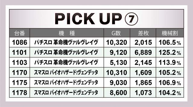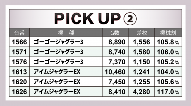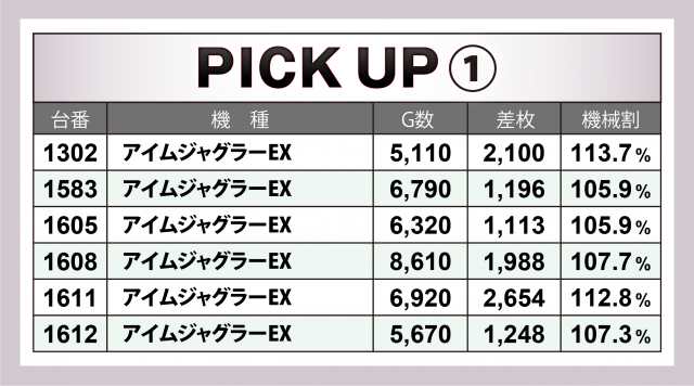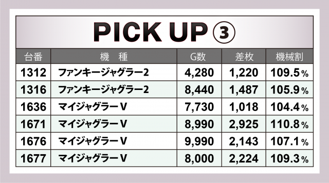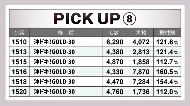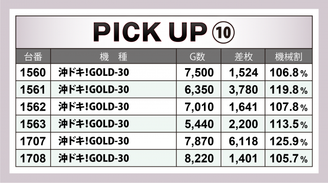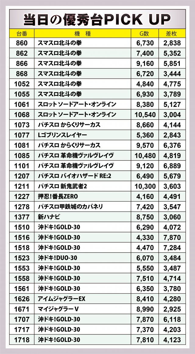 まずは優秀30台のPICK UPからチェック。30台全てが差枚数+2千枚以上を達成し、+3千枚以上は全体の9割となる27台、+4千枚オーバーは全体の6割となる18台、+5千枚オーバーは全体の3分の1弱となる9台、+6千枚オーバーは5台と、いつもにも増してハイレベルな内容となった。