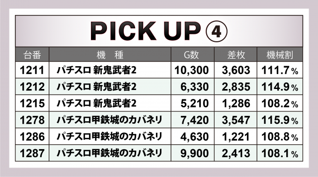 続いては上に挙げたマシンにも負けない枚数を叩き出した10機種計60台をチェック。60台全てが4桁以上のプラスとなり、同店らしい高水準をキープした。