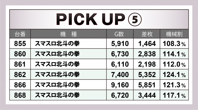 また『スマスロ北斗の拳』12台では合計+3万5千枚を突破、+5千枚超×2・+4千枚超×1と、こちらも好況に沸いた。