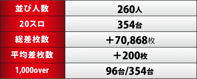 ここからは20スロ全354台の出玉データ詳細を基に、当日の優秀台を追っていこう。