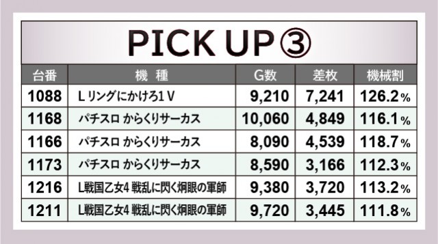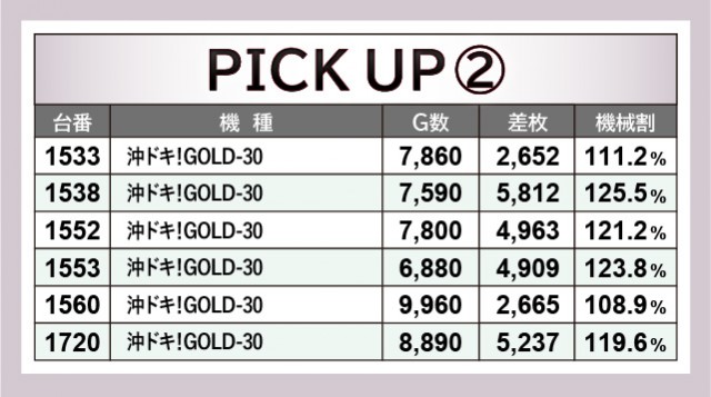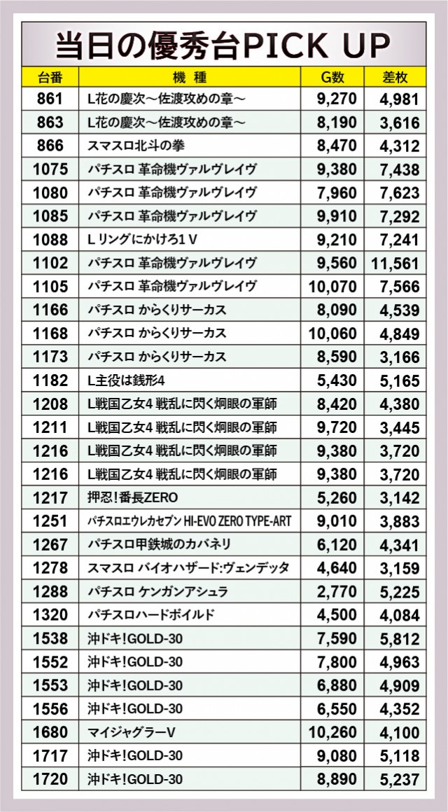 『パチスロ 革命機ヴァルヴレイヴ』の活躍は上表の通りで、万枚OVERのみならず、4台の7千枚OVERが発生。回転数を見ても手ごたえのほどを窺うことができ、レバーオンに力が入っていたはずだ。また『沖ドキ!GOLD-30』も4~5千枚OVERの熱気が見られ、『L リングにかけろ1 V』1088番台+7,241枚や『パチスロ からくりサーカス』『L戦国乙女4 戦乱に閃く炯眼の軍師』の高い活気も見逃せない。