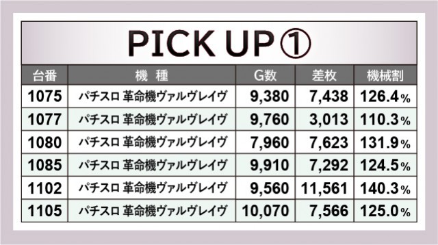 この日大きく活躍したのは『パチスロ 革命機ヴァルヴレイヴ』で、1102番台+11,561枚という大きな熱量のみならず、1105番台10,070Gという高い活気も見られた。これに続いて『パチスロ からくりサーカス』も盛り上がっており、ファンは好環境に恍惚の表情を浮かべていたことだろう。4~5千枚OVERも多く見られ、有意義な時間を過ごせたのは間違いない。