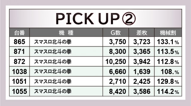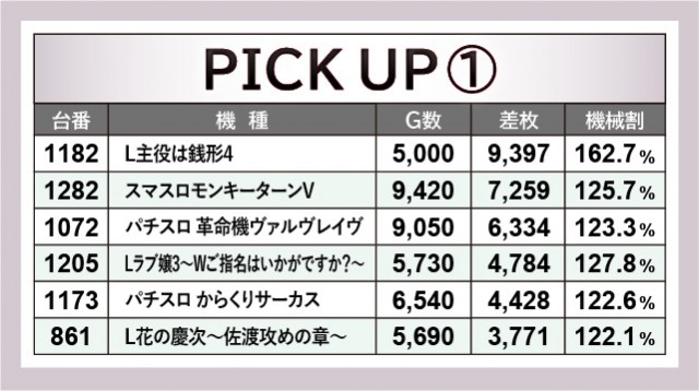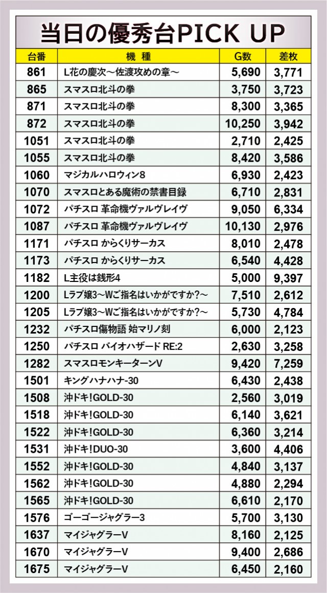 『スマスロ北斗の拳』『パチスロ 革命機ヴァルヴレイヴ』の2台から万回転OVERが生まれており、このほかにも8~9千回転台をマークする台が多々見られることから、店内は高い活気に包まれていたのが分かる。同時に高いポテンシャルを秘めていた事実が窺えるばかりで、遊技していたファンは力強くレバーを叩いていたことだろう。『L主役は銭形4』1182番台+9,397枚という鮮烈な記録もあり、大きく盛り上がった1日になったと言えよう。