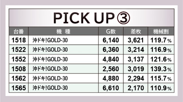 お馴染み『スマスロ北斗の拳』は高い回転数だけでなく、右肩上がりのグラフを形成していたのが印象的だ。安定感のあるパフォーマンスを披露しており、遊技していたファンは安心感を覚えたのではないだろうか。また『沖ドキ!GOLD-30』もコンスタントに2~3千枚OVERを叩き出しており、ハイビスカスの輝きが大きな癒しになっていたに違いない。