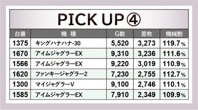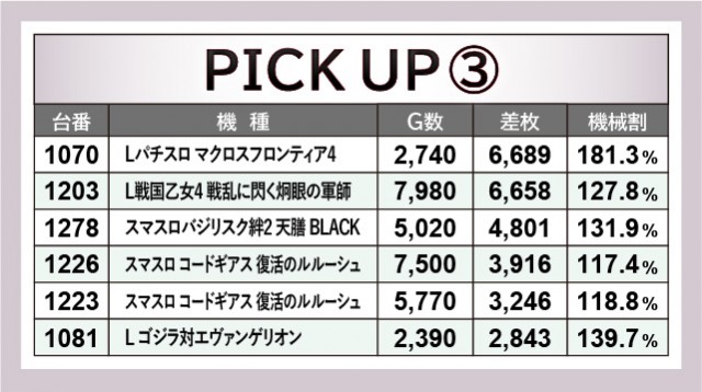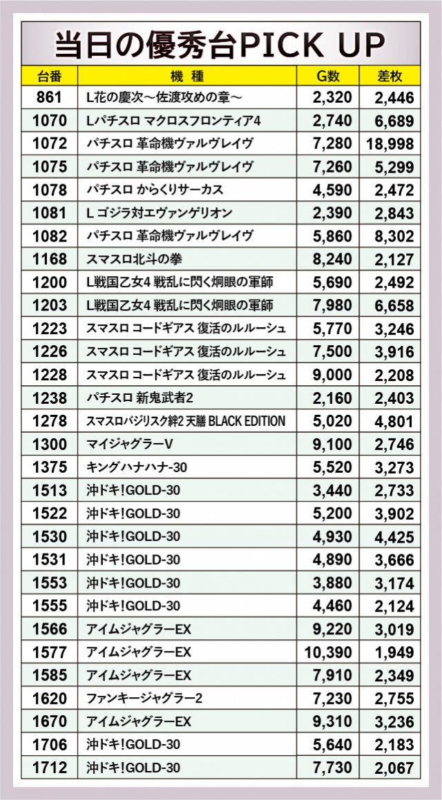 『Lパチスロ マクロスフロンティア4』1070番台+6,689枚や『L戦国乙女4 戦乱に閃く炯眼の軍師』1203番台+6,658枚と、AT機群もしっかりと盛り上がりに貢献。回転数の少なさが目立つ台こそあるが、短時間ながらポテンシャルがしっかりと引き出されていたと言える。『ジャグラー』『キングハナハナ-30』も安定したパフォーマンスで、ファンに笑顔をもたらしたようだ。