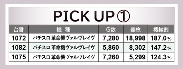 『パチスロ 革命機ヴァルヴレイヴ』1072番台+18,998枚という大車輪の活躍が見られ、店内は凄まじい熱気を放っていた。ほかにも1082番台+8,302枚や『L戦国乙女4 戦乱に閃く炯眼の軍師』1203番台+6,658枚と、大台を突破する台を確認できる。また『ジャグラー』シリーズは多くのゲーム数が消化され、大きな手応えを感じていた様子が目に焼きつくばかりだ。