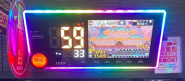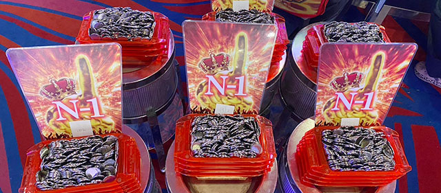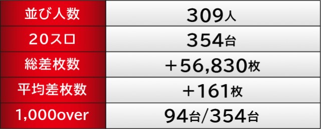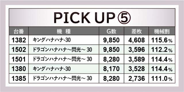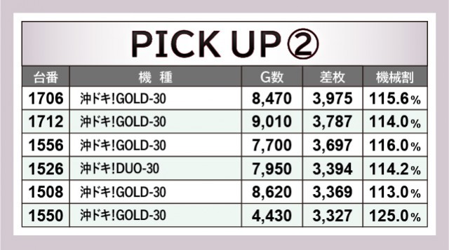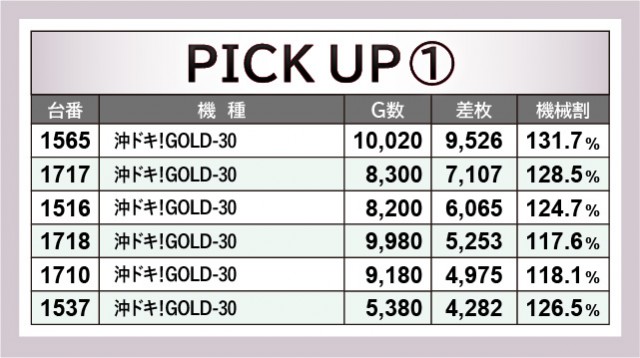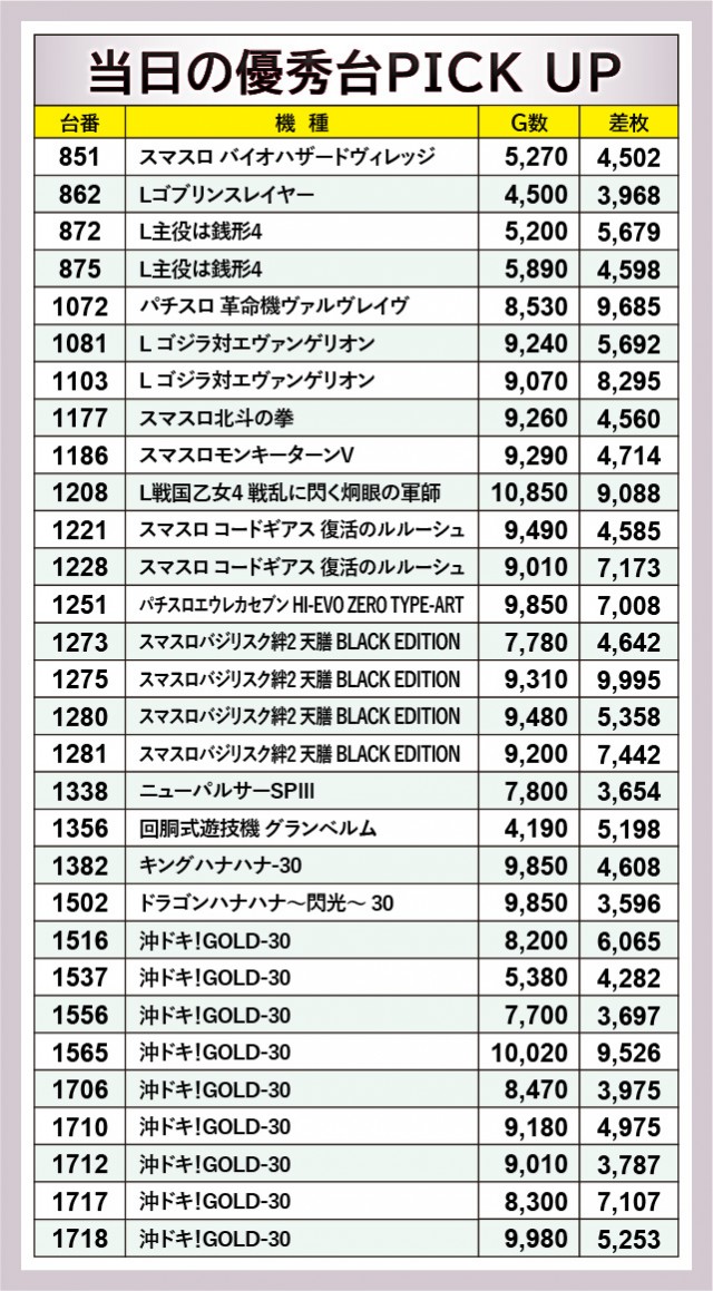 店内設置台数最多となる『沖ドキ!GOLD-30』の活躍が凄まじく、1565番台10,020G+9,526枚と先陣を切っていた。ほかにも1717番台+7,107枚や1516番台+6,065枚、さらには上表を見れば分かるように、3千枚OVERが多く見られたのが印象的である。ハイビスカスの輝きが島を照らし、店内に活気と熱気をもたらしたと言えるだろう。