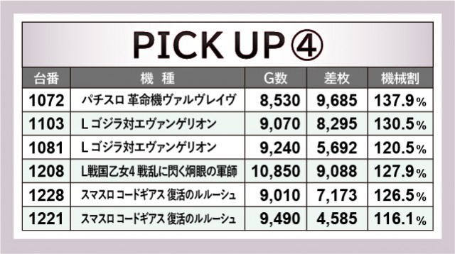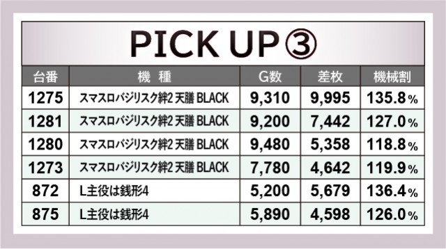 万枚OVERこそ見られないが、それに準ずる活躍を披露する台が多発した。『パチスロ 革命機ヴァルヴレイヴ』1072番台+9,685枚・『スマスロバジリスク~甲賀忍法帖~絆2 天膳 BLACK EDITION』1275番台+9,995枚・『沖ドキ!GOLD-30』1565番台+9,526枚と、惜しくも万枚に到達しなかったが大きな盛り上がりを披露。万回転に到達する台、何より8~9千回転台をマークする台も多く、ファンが有意義な時間を過ごせたのは間違いない。