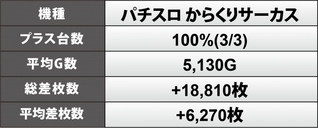 『パチスロ からくりサーカス』3台は全てがプラスをマーク、+9千5百枚弱・+8千枚超が1台ずつ、合わせて+1万9千枚弱、1台あたりの平均は+6千3百枚弱と高いものとなった。