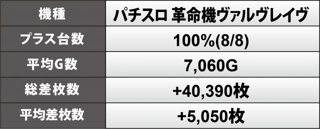 『パチスロ 革命機ヴァルヴレイヴ』8台は+1万2千枚超を筆頭に全ての台が勝利となり、次いで+8千6百枚超・+5千2百枚超・+4千6百枚弱が1台ずつ、その合算は+4万枚超のビッグヒット、平均は+5千1百枚弱と、こちらもハイクラス。