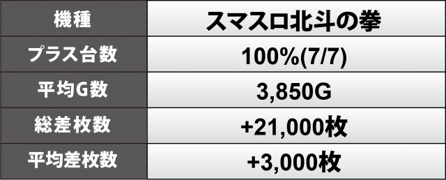 『スマスロ北斗の拳』7台も全勝を収めた。こちらでも+1万2千枚超を頂点に+2千8百枚超が1台ずつ、累計で+2万1千枚、1台あたりでは+3千枚と、こちらもレベルが高かった。