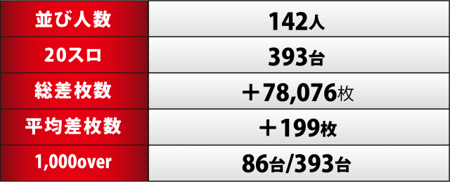 この日、20スロ全393台の総計では差枚数+78,076枚と、同店で実施してきた「英雄のリアル」全5回の中で最高となる数値を叩き出した。