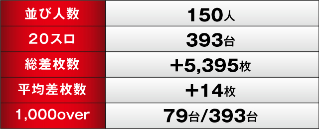 終わってみれば優秀台、高勝率機種の活躍で、トータルで+5,395枚のプラスを記録。1,000over台も79台/393台をマークしており、満足度の高い一日となった。この調子で、次もプラスを決めたいものである。