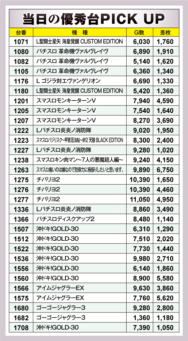 優秀台を見てみると、新鋭『スマスロ痛いのは嫌なので防御力に極振りしたいと思います。』の活躍が目立った。1263番台が+6,750枚をマーク。防御力だけでなく攻撃力の高さを披露してくれた。それに続いたのが+5,620枚を記録した『アイムジャグラーEX』1575番台。スマスロにひけを取らない力強さはさすが人気機種。僅差だったのが+5,580枚の『沖ドキ!GOLD-30』の1560番台だった。『チバリヨ2』も負けてはいない。1277番台が+4,950枚、1276番台が+4,460枚の活躍を見せていた。以下、+4,590枚の『スマスロモンキーターンV』1201番台、+4,150枚の『スマスロキン肉マン〜7人の悪魔超人編〜』1238番台と続いた。