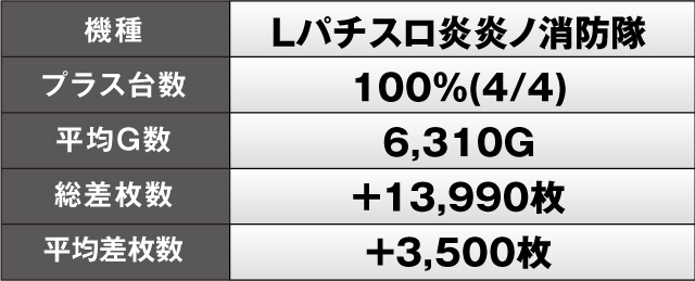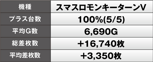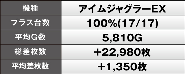 勝率の良かった機種を見てみると、勝率100%を記録したのは3機種。『スマスロモンキーターンV』が5台中5台がプラス、『パチスロ炎炎ノ消防隊』が4台中4台がプラス、『アイムジャグラーEX』にいたっては17台中17台がプラスと絶好調。シマ全体で大いに盛り上がっていた。