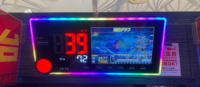 『Lパチスロ戦姫絶唱シンフォギア 正義の歌』では1076番台が+13,100枚超でこの日の頂点に輝いた他に+7,600枚弱&+6,100枚弱&+4,400枚弱が1台ずつ、『スマスロモンキーターンⅤ』では+9,400枚超&+6,300枚超&+4,100枚弱と両者どちらもハイレベルにあり、双方いわゆる「全台系」という状況だと推測された。
