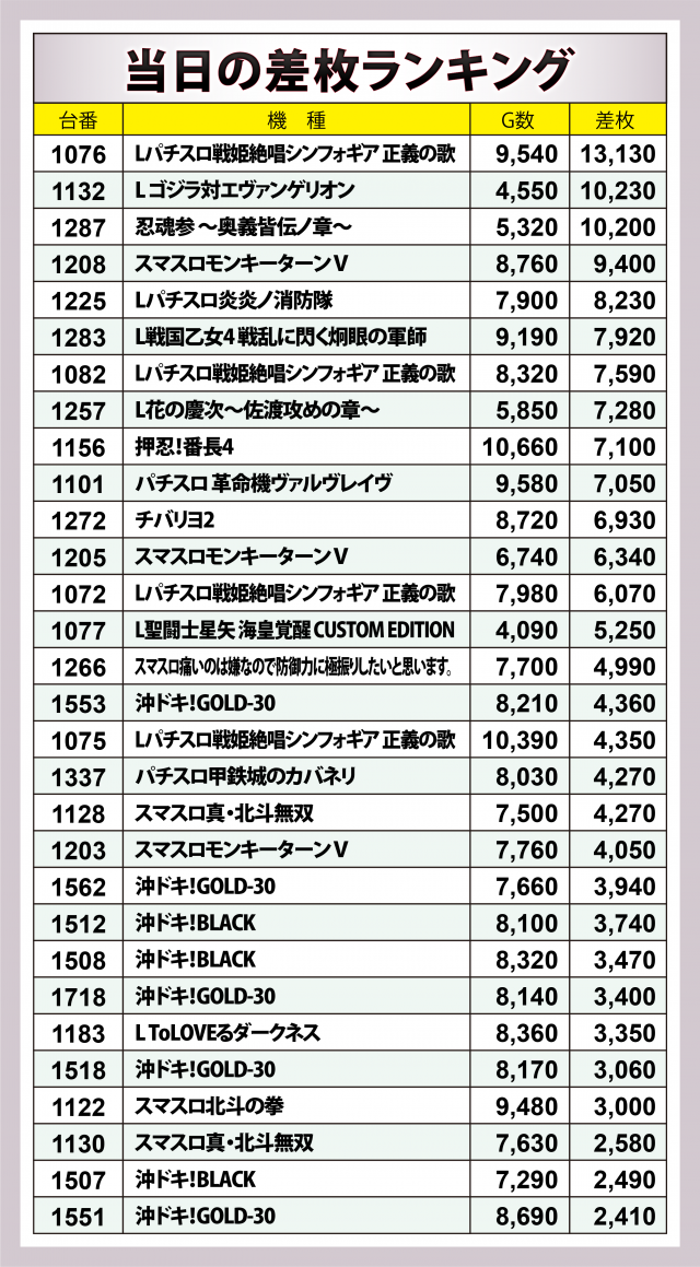 ※差枚数順に掲載しています。